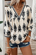Beige Vintage Geometric Printed 3/4 Sleeve V Neck Blouse