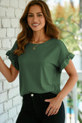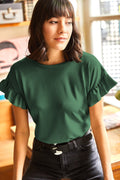 Blackish Green Solid Color Ribbed Ruffled Short Sleeve T Shirt
